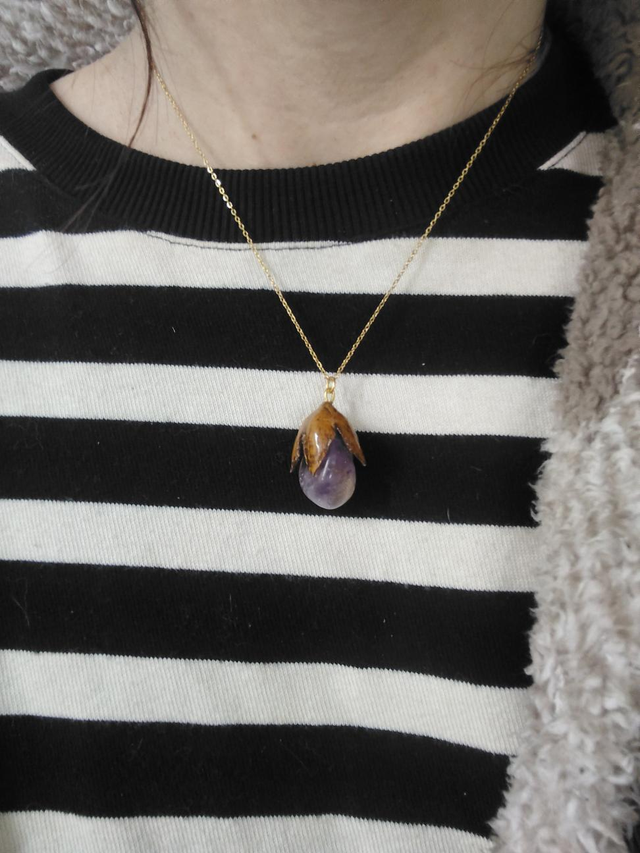 Collier féerique en faîne de hêtre et pierre naturelle d'améthyste, chaîne acier inoxydable 50 cm 📿🌿