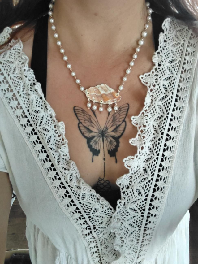 Collier artisanal fabriqué avec un fragment de coquillage et des perles blanche, la longueur de la chaîne fait 50 cm 🐚🌊 matière de la chaîne en laiton