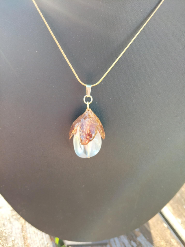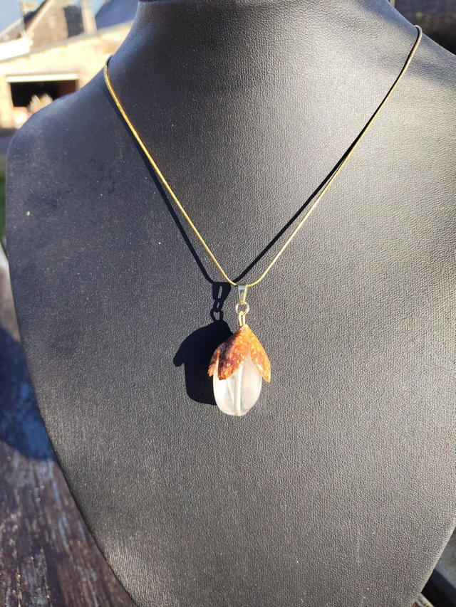 Collier artisanal "Nymphe" fabriqué en faîne de hêtre et crystal de roche chaîne doré en acier inoxydable 50 cm